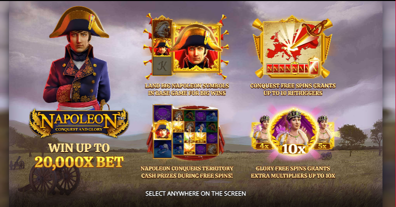 Win Big with the Napoleon Jackpot: Players can strike it rich with the Napoleon Jackpot, offering a massive 20,000x the stake. The game boasts Grand Napoleon symbols (up to 4×4). Furthermore, Conquest free spins with Cash Collection, and Glory Free Spins with up to 10x multipliers.