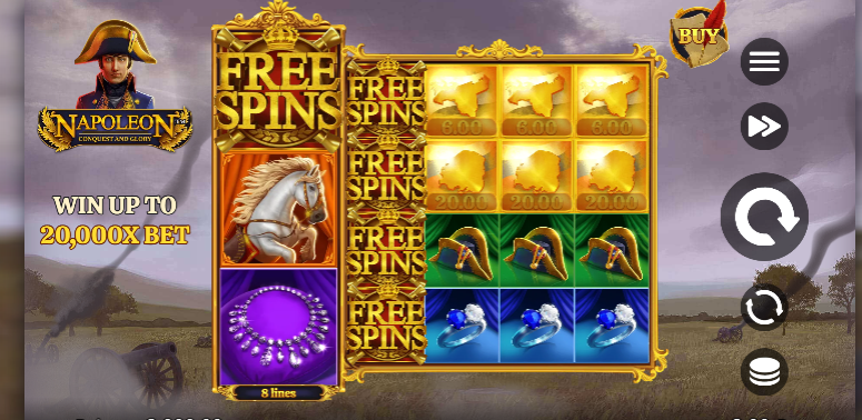 Game Features Unveiled: The Napoleon symbol is key, varying from a single position to a dominant 4×4 presence on the last four reels. Trigger free spins with special scatter symbols, and enjoy higher chances of forming valuable combinations with low-value Royals removed.