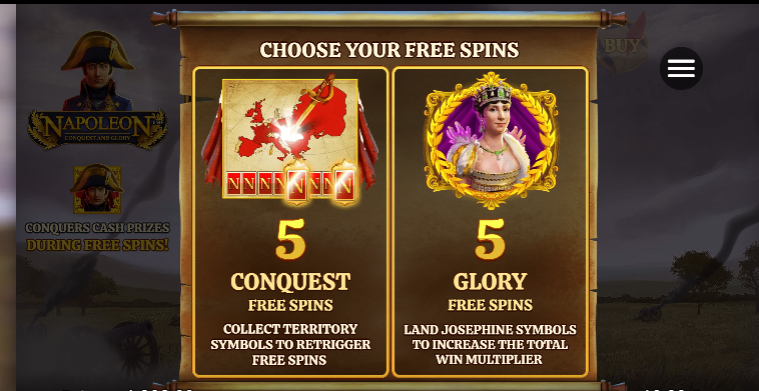 Choose Your Free Spins Adventure: Collect Territory symbols for prizes in Conquest free spins, or opt for Glory Free Spins where Josephine’s image can boost multipliers up to 10x.